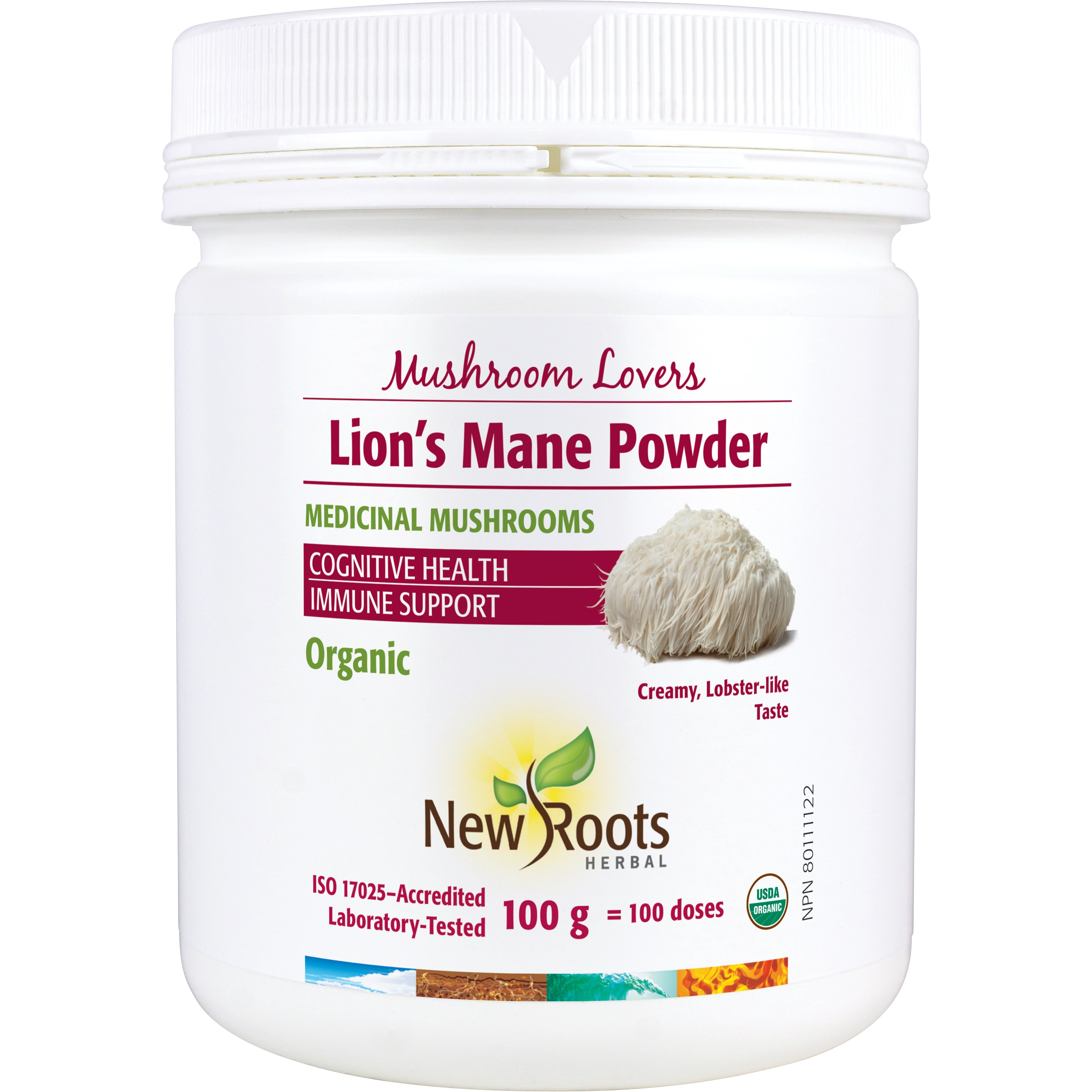 New Roots Herbal’s certified organic Lion’s Mane Powder is 100% pure and made with mushrooms grown in climate-controlled greenhouses on species-specific organic matter, free from herbicides, pesticides, and heavy-metal contamination. With 61 doses, each 100-gram container is good for a minimum of two months.