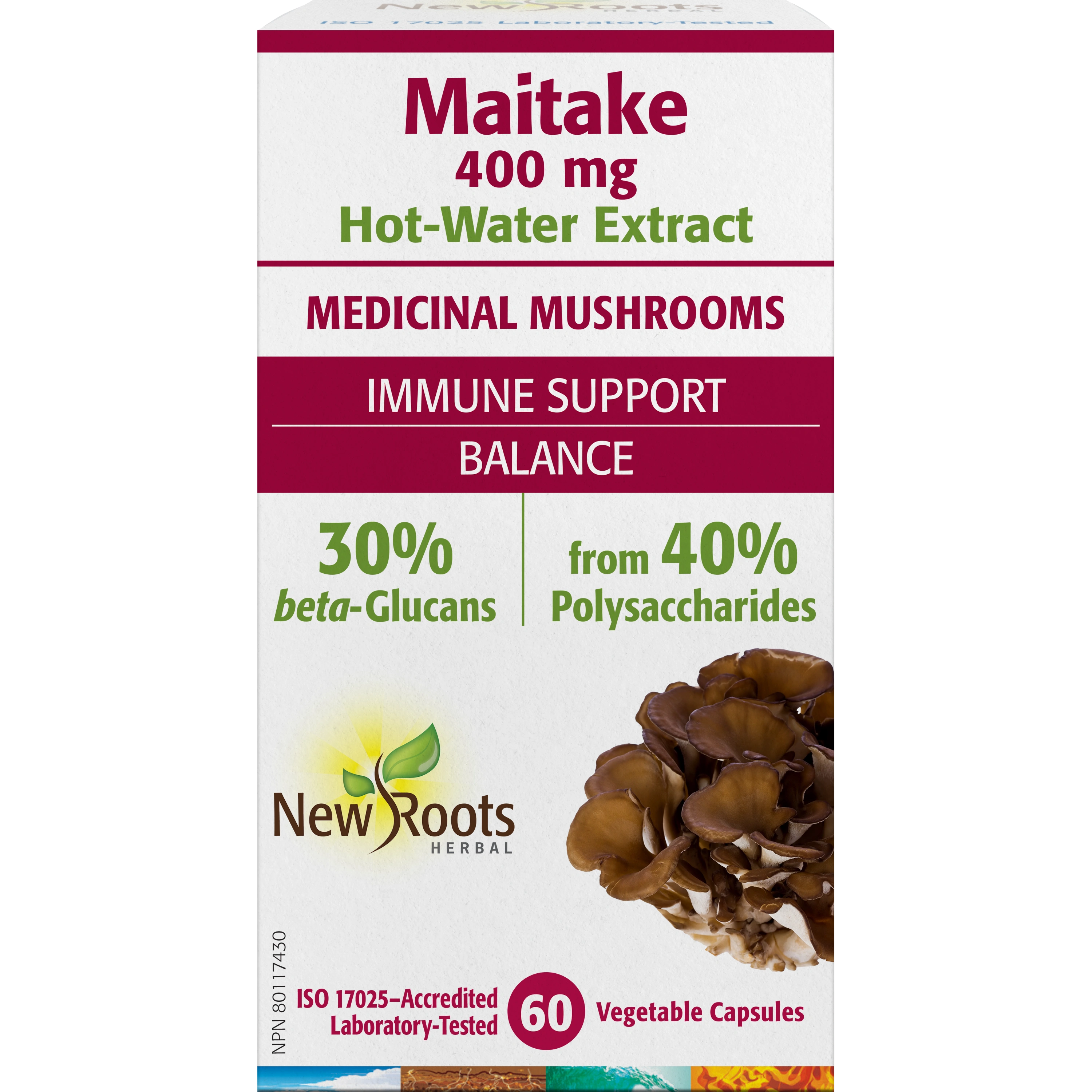 New Roots Herbal’s Maitake (Grifola frondosa) is a hot water–extracted medicinal mushroom formula standardized to contain 40% polysaccharides (400 mg per capsule). Hot-water extraction is critical in obtaining a high-quality and effective mushroom product, and is the traditional Asian method of extraction. In the whole mushroom, polysaccharides are bound by indigestible cell walls comprised of chitin; chitin must be dissolved through hot water in order to gently release the medicinal components, the mushroom polysaccharides. Conversely, grinding the mushroom may cause damage to the long-chain polysaccharides and fails to remove the indigestible chitin (fibre), limiting the amount of therapeutic constituents that can be fit per capsule. Standardization ensures that the final product contains a consistent amount of polysaccharides to allow delivery of a therapeutic dose.